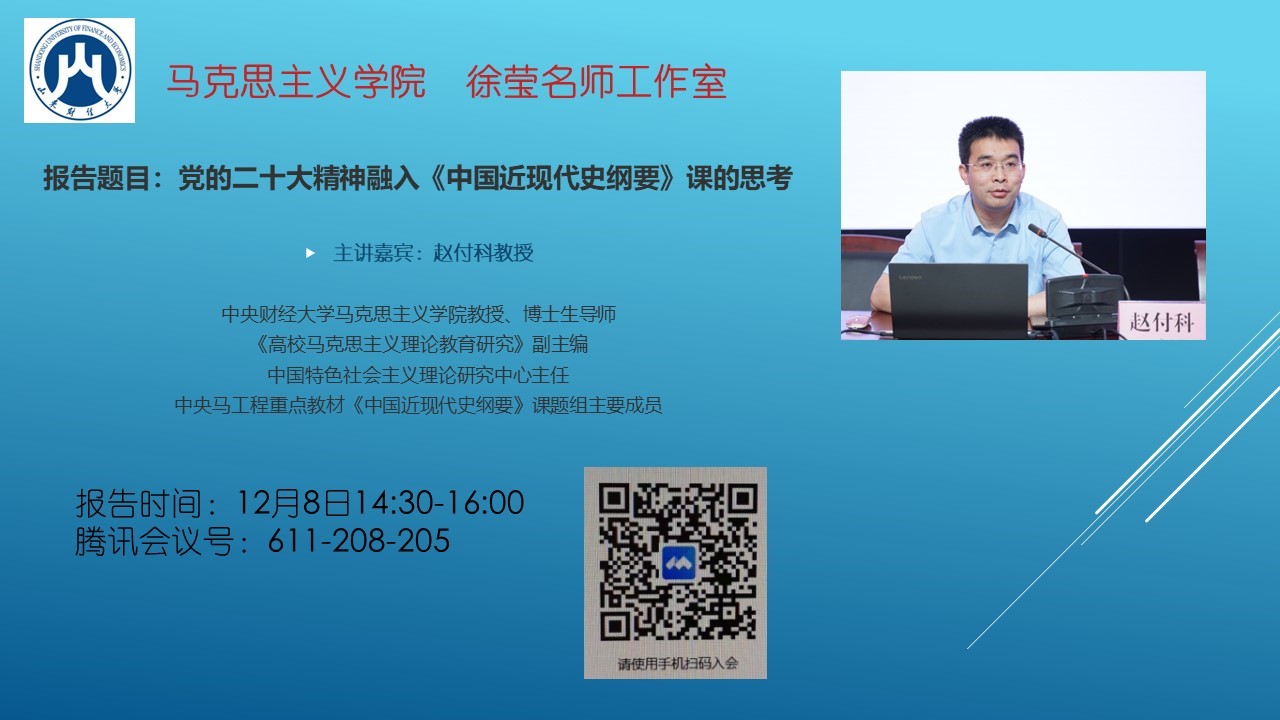 12�8日,应马克思主义学陀徐莹名师工作室邀请,中央财经大学马克思主义学院博士生导师赵付科教授,通过线上为我院教师做了题为《党的二十大精神融入<中国近现代史纲要>课的思考》的专题讲座。讲座由院长徐莹主持,《纲要》课教研室全体老师及其他教研室的部分老师聆听了讲座�