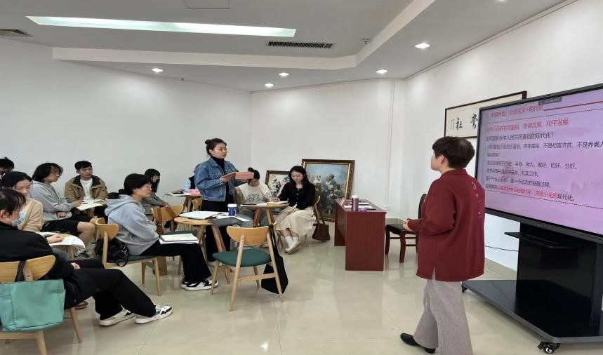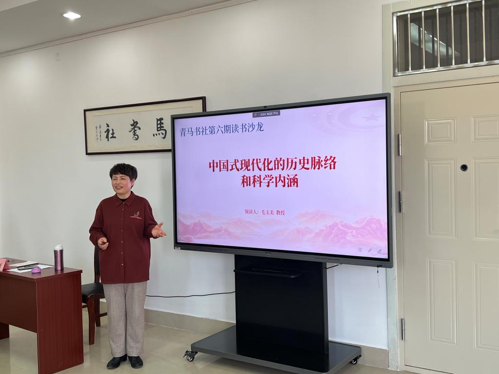 为学习贯彻党的二十大精神,进一步推进学习贯彻习近平新时代中国特色社会主义思想主题教育,提升青年学生的理论修养、思想政治觉悟�4�26日上午,马克思主义学院在图书�616青马书社活动室举办以“中国式现代化的历史脉络和科学内涵”为主的读书沙龙活动。本次读书沙龙活动由青马书社指导教师王静主持,邀请到毛玉美教授领读,吸引了来自马克思主义学陀法学院、计算机科学与技术学陀统计与数学学院、艺术学院等50余位研究生、本科生参与活动并积极发言�