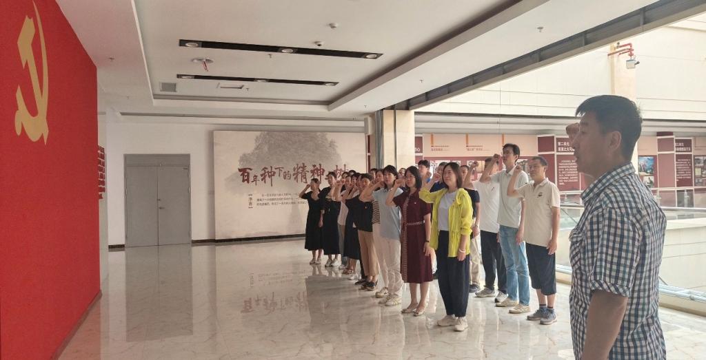 参观结束后,全体党员代表精神饱满,面对庄严的党旗,举起右手,握紧拳头,重温入党誓词,作出忠诚�党的庄严承诺�