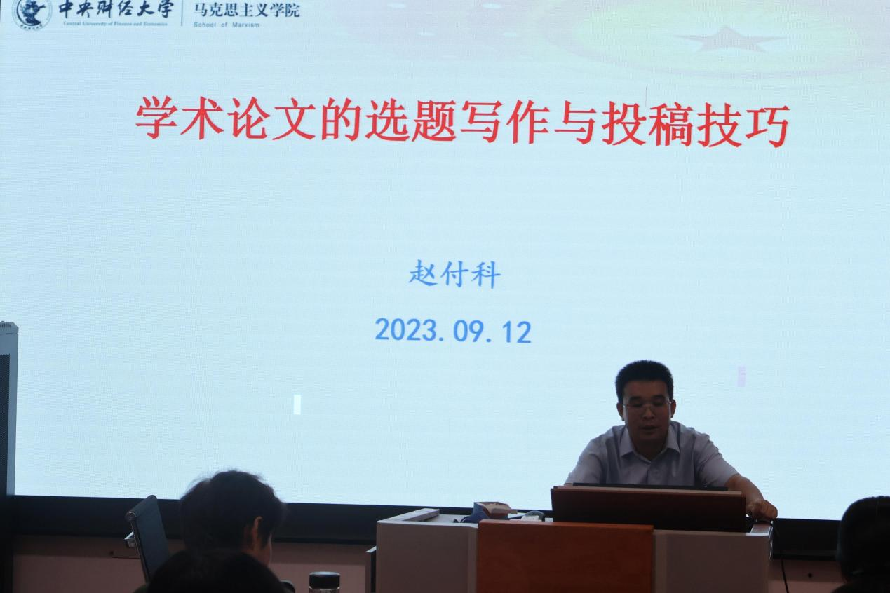 9�12日下午,中央财经大学马克思主义学院教授、博士生导师、《高校马克思主义理论教育研究》杂志副主编赵付科应我院邀请,在图书馆501室做题为《学术论文的选题写作与投稿技巧》的专题讲座。讲座由院长徐莹主持,学院部分师生聆听了讲座�