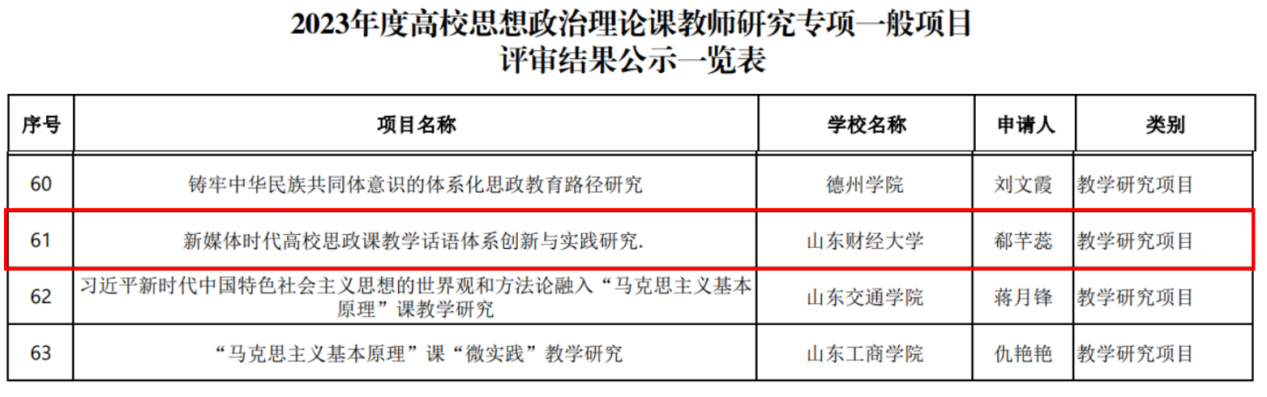 杩戞棩锛屾暀鑲查儴绀剧鍙稿叕绀轰簡2023骞村害楂樻牎鎬濇兂鏀挎不鐞嗚璇炬暀甯堢爺绌朵笓椤逛竴鑸」鐩瘎瀹$粨鏋溿傛垜闄㈡暀甯堥儣鑺婅晩鐢虫姤鐨勩婃柊濯掍綋鏃朵唬楂樻牎鎬濇斂璇炬暀瀛﹁瘽璇綋绯诲垱鏂颁笌瀹炶返鐮旂┒銆嬭幏鎵光滄暀瀛︾爺绌堕」鐩濈珛椤广�
