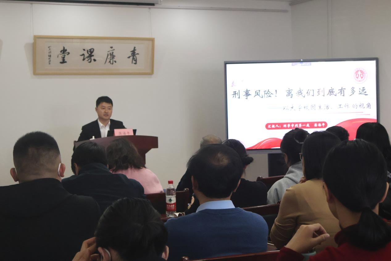 蒋海年副庭长围绕社会普遍关注的法律安全问题,从“�我防卫意识”“正确处理与他人关系”“洁身自好”“谨慎用权”“心存敬畏,守住底线”等九个案例出发,详细介绍案件带来的思考与警示。他指出,广大师生不仅要树立自我防卫意识,学习恰当的自我防措施,也要时刻绷紧廉洁自律之弦,严格规范和约束自己的行为,在日常生活中学法、懂法、守法,守正笃实,久久为功。学校要教育引导青年学生做法治的忠实崇尚者、法治的自觉遵守者、法治的坚定捍卫者,充分发挥思想政治教育主阵地的作用,为高质量建设法治中国贡献教育力量�