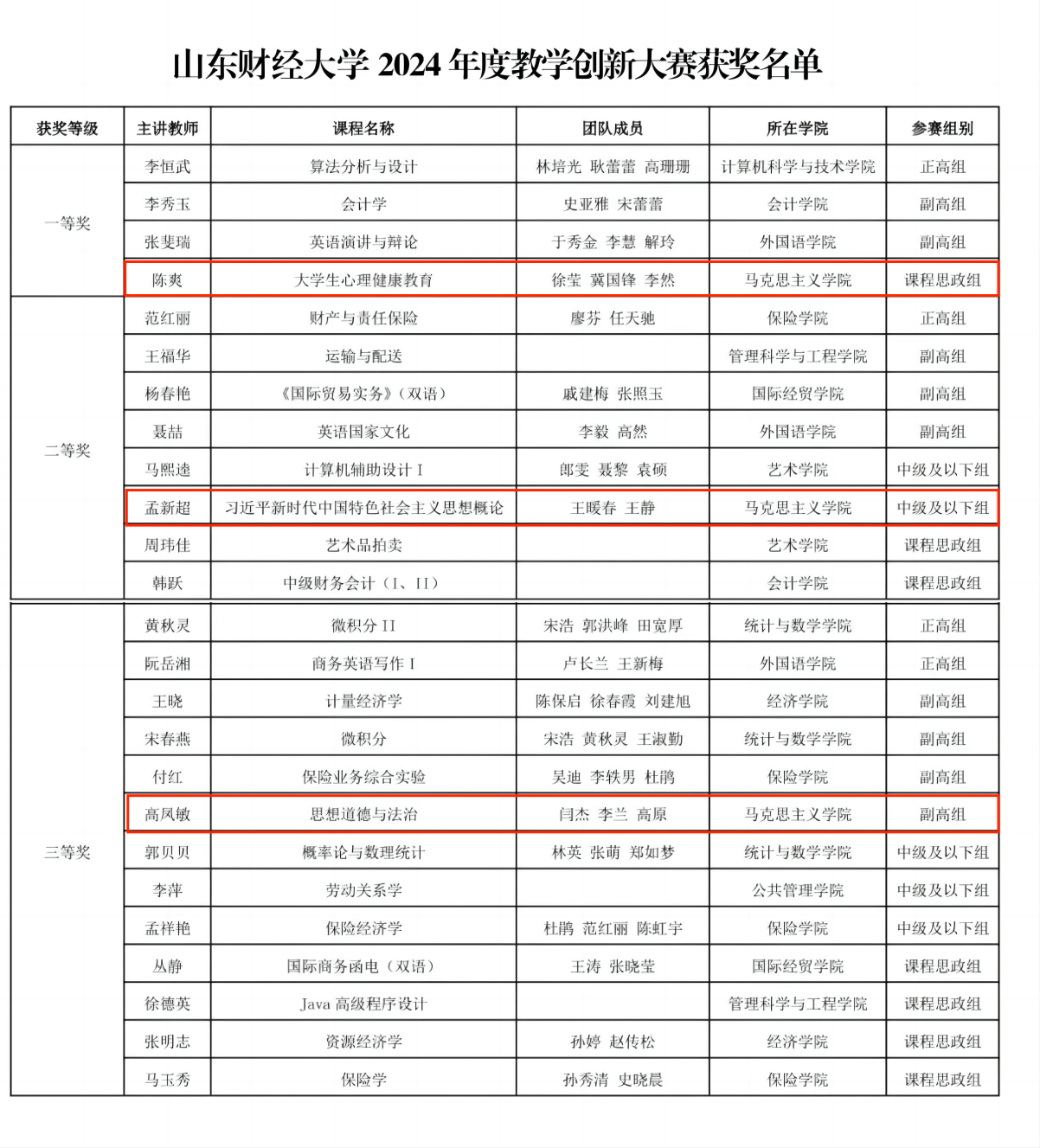 徐莹教授团队申报的《中国近现代史纲要》再获佳绩,根据比赛规则不重复授奖,作为校级基础课程正高组代表学校推荐参加省赛;陈爽老师团队申报的《大学生心理健康教育》获校级课程思政组一等奖,作为校级课程思政组代表学校参加省赛。孟新超老师团队申报的《习近平新时代中国特色社会主义思想概论》获校级中级及以下组二等奖,高凤敏老师团队申报的《思想道德与法治�获校级副高组三等奖�