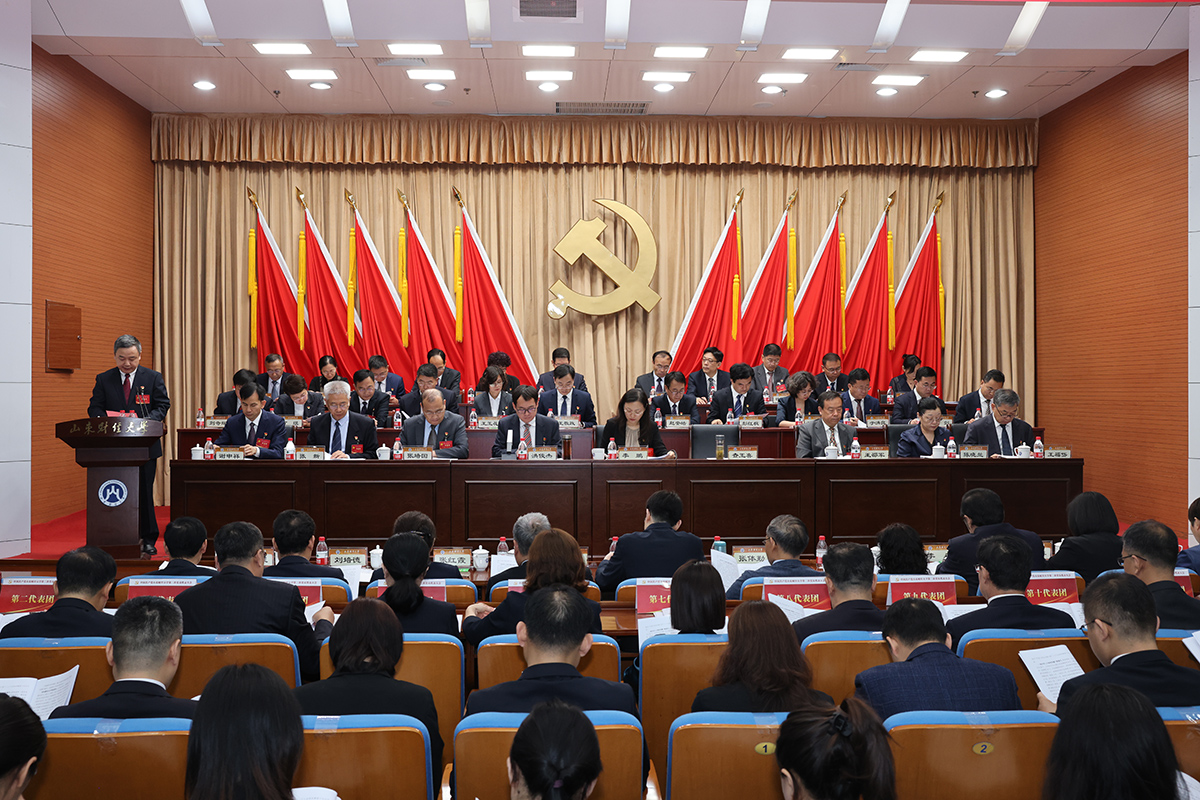 浼氬満鍐呮皵姘涘簞閲嶇儹鐑堬紝涓诲腑鍙颁笂鏂规偓鎸傜潃鈥滀腑鍥藉叡浜у厷灞变笢璐㈢粡澶у绗簩娆″厷鍛樹唬琛ㄥぇ浼氣濈殑浼氭爣锛屽悗骞曟涓槸闀板垁鍜岄敜澶寸粍鎴愮殑鍏氬窘锛�10闈㈤矞鑹崇殑绾㈡棗鍒嗗垪涓や晶锛屾姤鍛婂巺鍚庢柟鎮寕鐫鈥滃嚌蹇冭仛鍔涳紝鎺ョ画濂嬫枟锛屽鍔涜氨鍐欐柊鏃朵唬楂樻按骞宠储缁忓ぇ瀛﹀缓璁炬柊绡囩珷鈥濈殑妯箙锛屾尟濂嬩汉蹇冦佸偓浜哄杩涖�