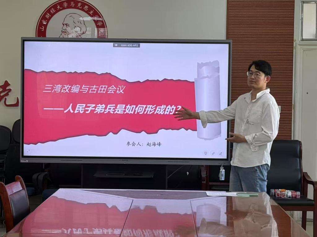 第二阶段开展教学展示与研讨环节。青年教师赵海峰博士以“三湾改编与古田会议—人民子弟兵是如何形成的”为主题进行教学展示。与会老师从教学设计、内容呈现、仪容教态等方面进行全面评议,提出优化建议:教学选题需增强问题意识,主题阐释应强化逻辑关联;课�制作宜采用结构化呈现,重点内容需视觉强化;教学语言应追求精准凝练,案例选取须兼顾学理深度与现实观照;教师教态需展现思政课教师特有的理论自信与教学风采�