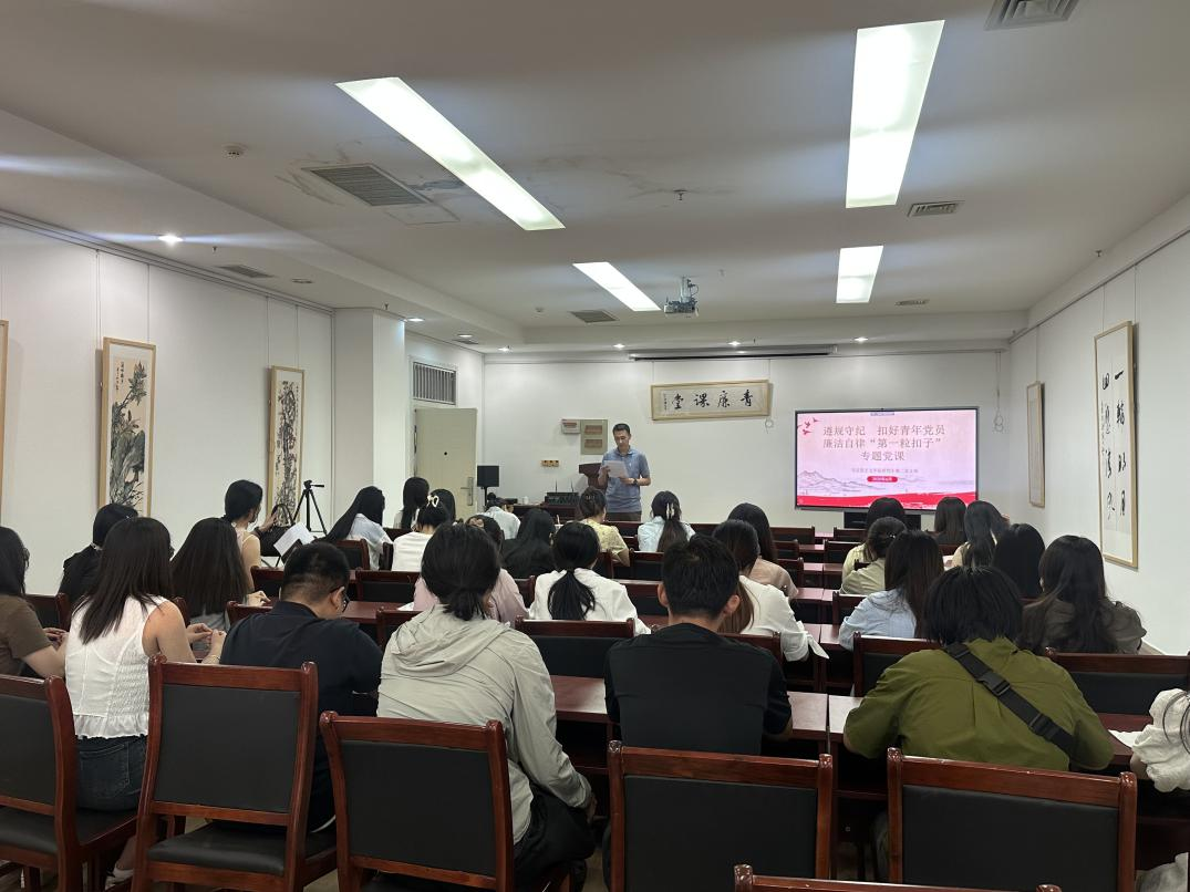 6�3日,马克思主义学院研究生第一、第二党支部在图书馆“青廉课堂”活动室开展“扣好人生第一粒扣子”专题党课,引导筑牢毕业生党员廉洁自律思想根基。会议由研究生党员毕逸飞同志�持,全体研究生党员参加�