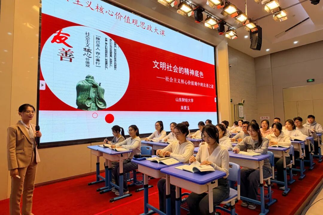 11�18日,活动由济南市委教育工作领导小组、山东大学等单位联合主办,济南市历下区教体局和山东财经大学马克思主义学院承办的“友善之� 照亮成长”社会主义核心价值观思政大课活动在山东省实验中学德润校区举行。马克思主义学院党委书记刘国强出席活动并致辞,王敏副院长进行�评�
