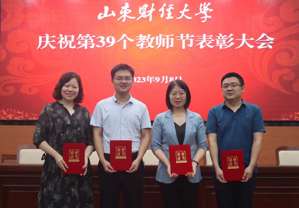 在表彰会上,我院多位教师获得表彰。徐莹入选山东省理论人才“百人工程”,�2022年度“山东学校思政课教师年度人物”表彰;王广获山东财经大�2023年度优秀教师表彰;郭小丽获山东财经大�2023年优秀工会工作者表彰;侯继迎获山东财经大学2023年研究生招生考�先进工作者�2023年度山东财经大学优秀科研成果奖一等奖表彰;范子谦获第二届全省学校思想政治理论课教学比赛一等奖以及山东财经大学2023年师德师风先进个人表彰;王真真获第二届全省学校思想政治理论课教学比赛一等奖表彰�